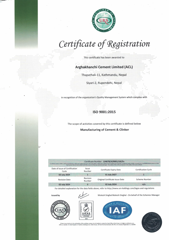 Arghakhanchi Cement Ltd. is a leading cement manufacturer in Nepal with a one-million-ton annual production capacity. It is a major producer of OPC and PPC through its advanced production plant. ACL has a decade-long track record of producing high-quality clinkers and cement, recognized with the Nepal Standard Mark (NS: 572) by the Government of Nepal.